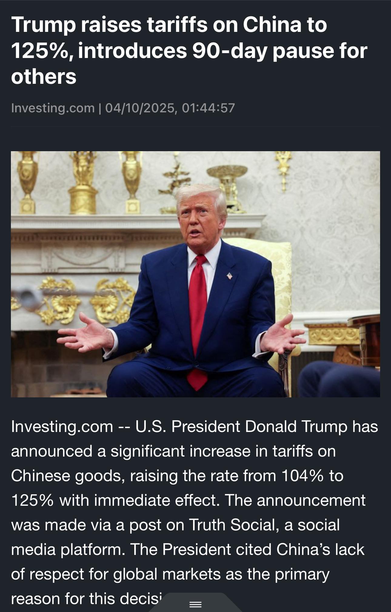Riêng Trung Quốc thuế tăng lên 125% vì đã “thiếu tôn trọng nền thương mại toàn cầu”